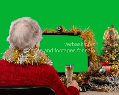 A gray-haired old lady cannot celebrate Christmas Eve with her family. She can only communicate with them on the Internet. The elderly woman raises a celebratory toast in front of a chroma key monitor. Everything around is decorated with tinsel. The background is also green.