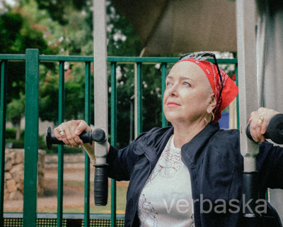 The image depicts a bald woman wearing a red bandana exercising on an outdoor exercise machine in a park. She appears to be performing a chest press or similar upper body exercise, gripping the handles of the machine firmly. The woman is dressed in a casual outfit, including a black jacket and a white shirt with a floral design. She also has hoop earrings, a ring on her right hand, and a bracelet on her left wrist. Her expression is focused and serene, suggesting determination and positivity. Engaging in physical exercise during chemotherapy is crucial for maintaining physical and mental health.